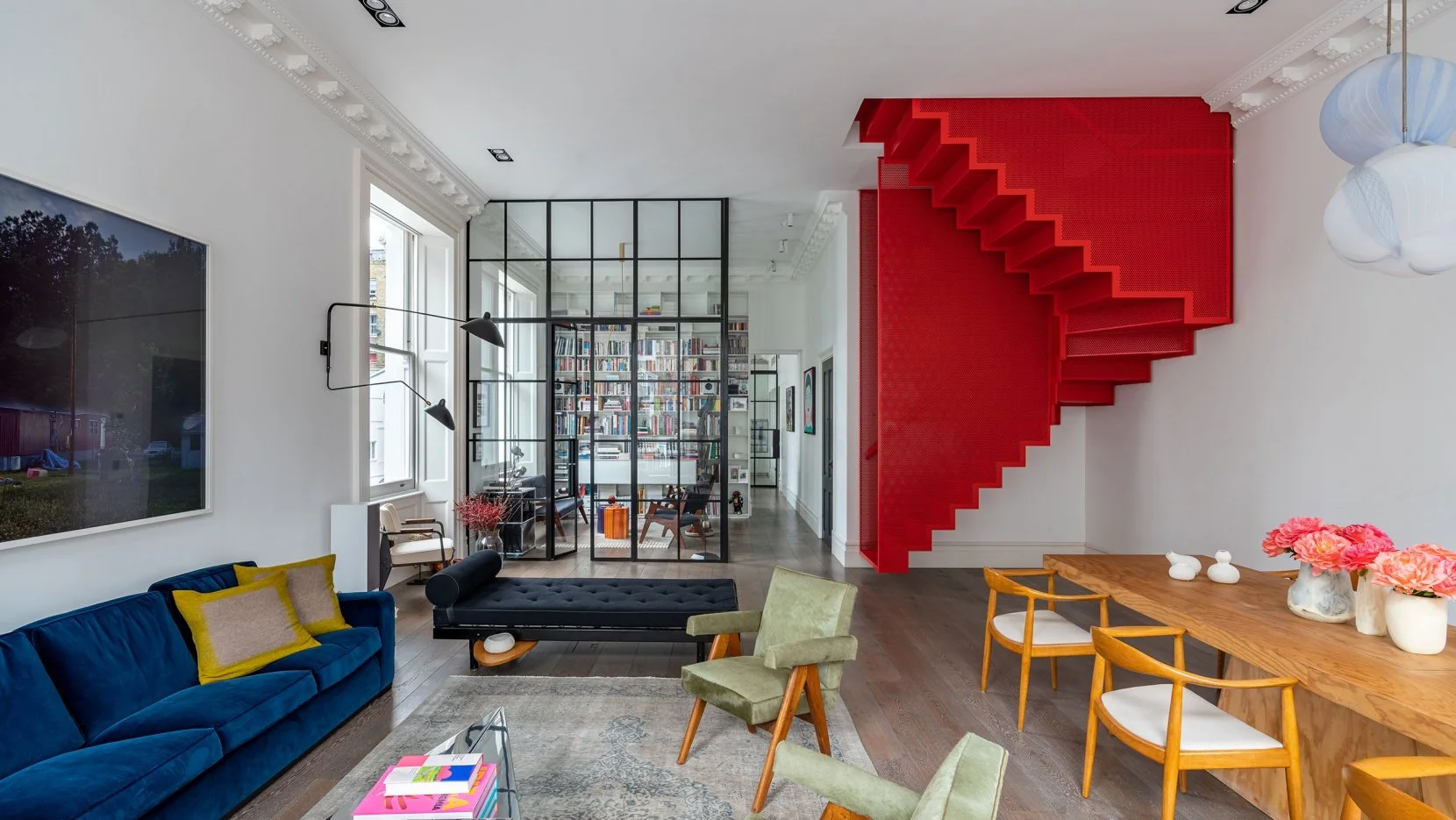 Spread across three floors, the house's standout feature, both conceptually and visually, is the vibrant red staircase that connects the living space on the first level with the private quarters on the second. This architectural marvel, designed in collaboration with Diapo and Webb Yates Engineers, draws inspiration from Korean artist Doh Ho Suh's installation, Staircase-III, at the Tate Modern. The staircase's floating design and striking color transform it from a functional element into a sculptural work of art. By utilizing perforated metal instead of red polyester fabric, the architects ensure structural integrity while capturing the ethereal qualities of the artwork. This unique structure embodies the owners' artistic interests, one of whom is a Parisian art consultant and collector, as well as Michaelis Boyd's design approach, which focuses on integrating art into daily life.