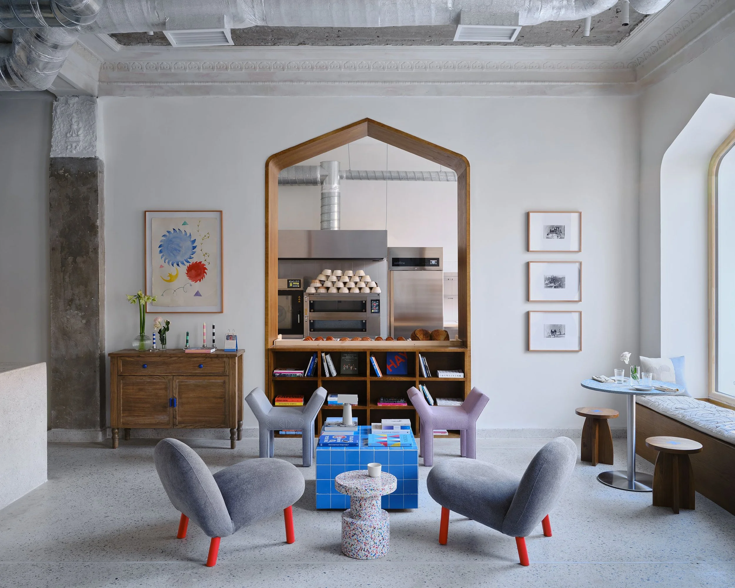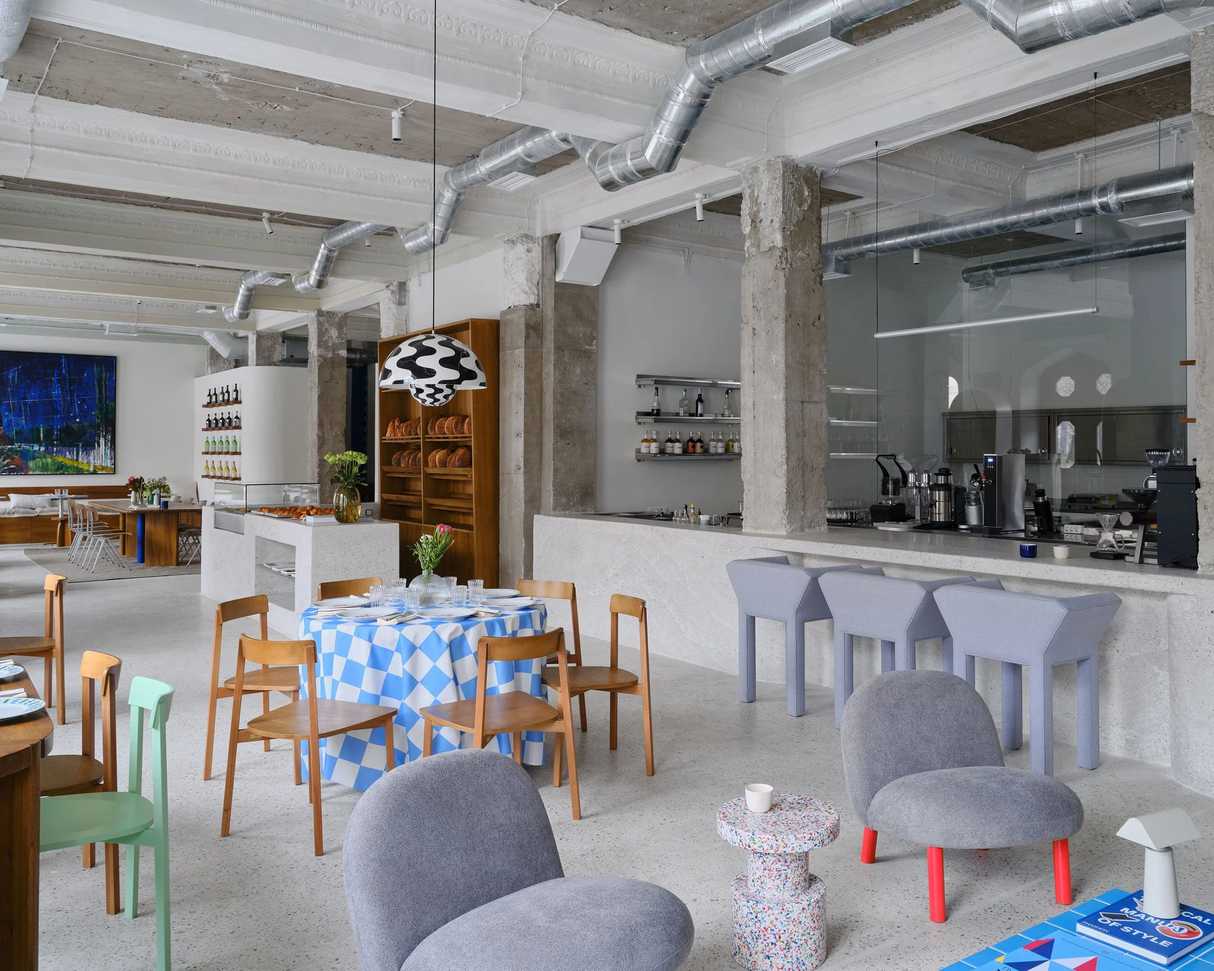 Dubbed FIKA, in homage to Swedish coffee culture, the restaurant's interior exudes Scandinavian chic while retaining its Soviet roots. Sunlight floods through expansive windows, illuminating bespoke furniture and playful design elements. Restored angular windows and terrazzo flooring seamlessly blur the boundaries between indoors and out, inviting patrons to linger and savor the ambiance.