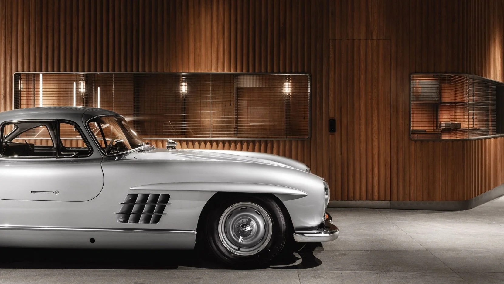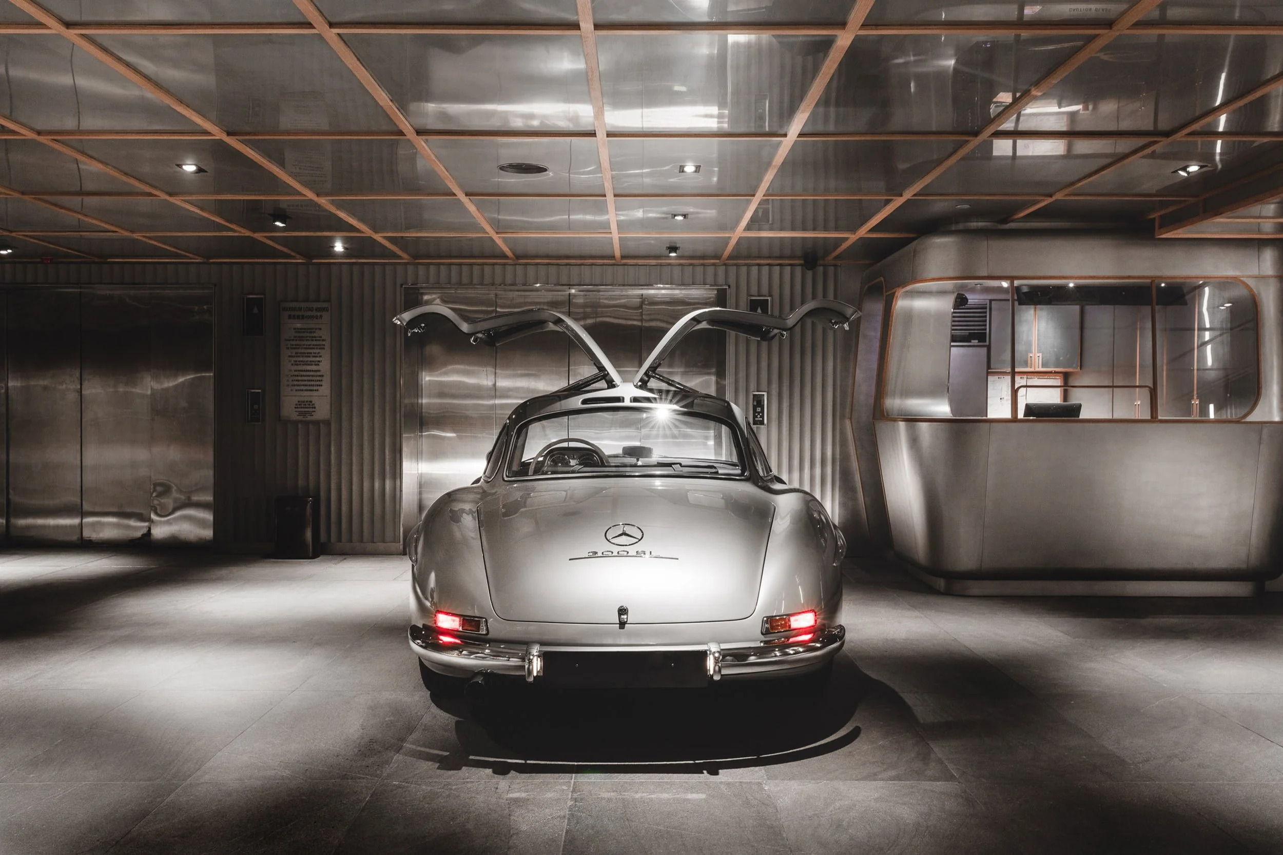 Moving upstairs to the showroom/lounge, the interior design transitions into a warmer ambiance characterized by the prominent use of wooden surfaces. Hardwood floors, timber-clad ceilings, and modular wall panels that can accommodate shelving, cabinets, and folded seating contribute to this inviting atmosphere. The retro-modern design language, defined by smooth lines, sinuous forms, and mid-century-inspired furniture, mirrors the displayed motor collection. Among the showcased cars are highly coveted and exceptionally valuable models such as the 1973 Porsche Carrera RS 2.7, the 1961 Ferrari 250 GT Berlinetta SWB, regarded as one of the greatest Ferraris of all time, and the Mercedes-Benz 300 SL gull-winged coupé, hailed as a marvel of design and engineering and awarded the title of "sports car of the century" in 1999.