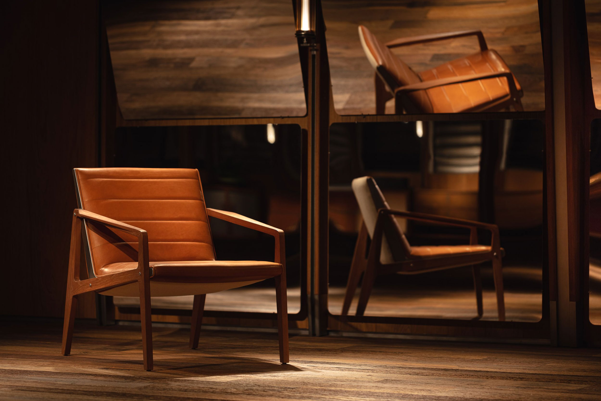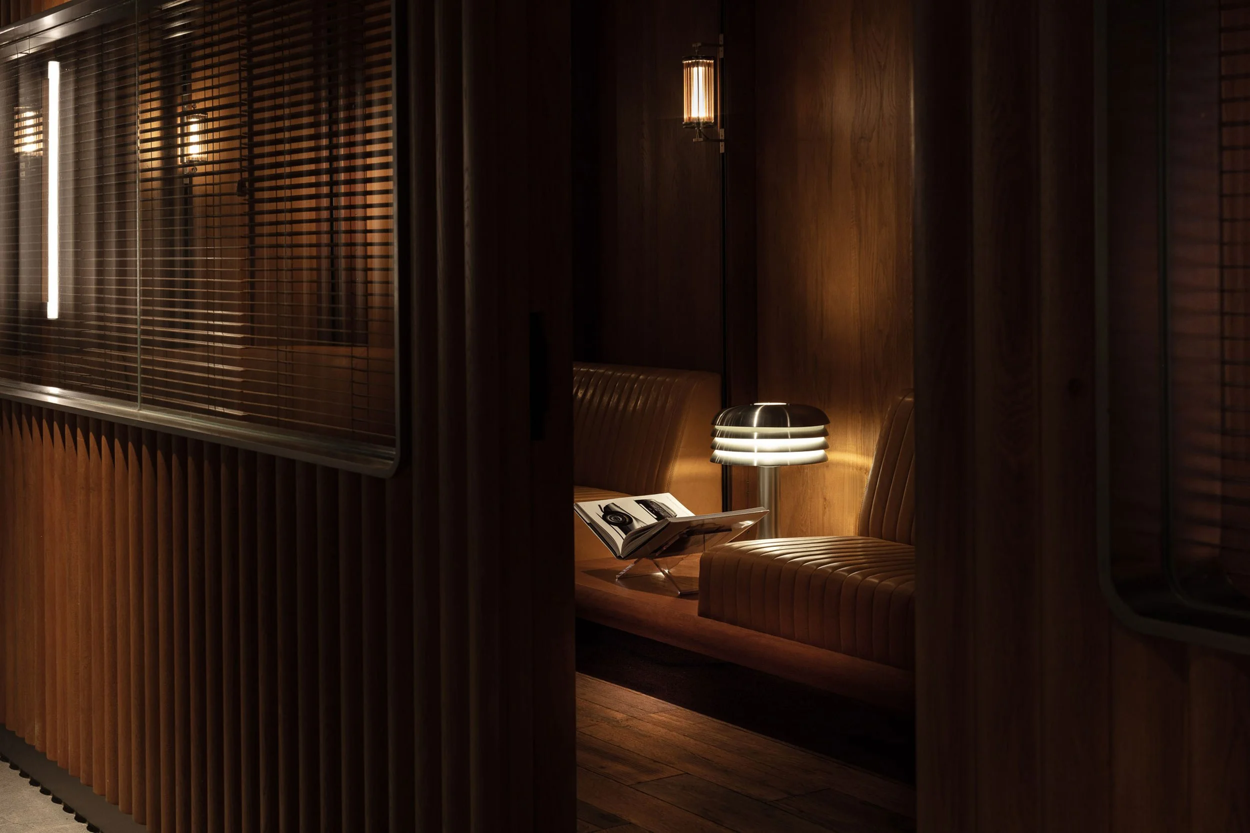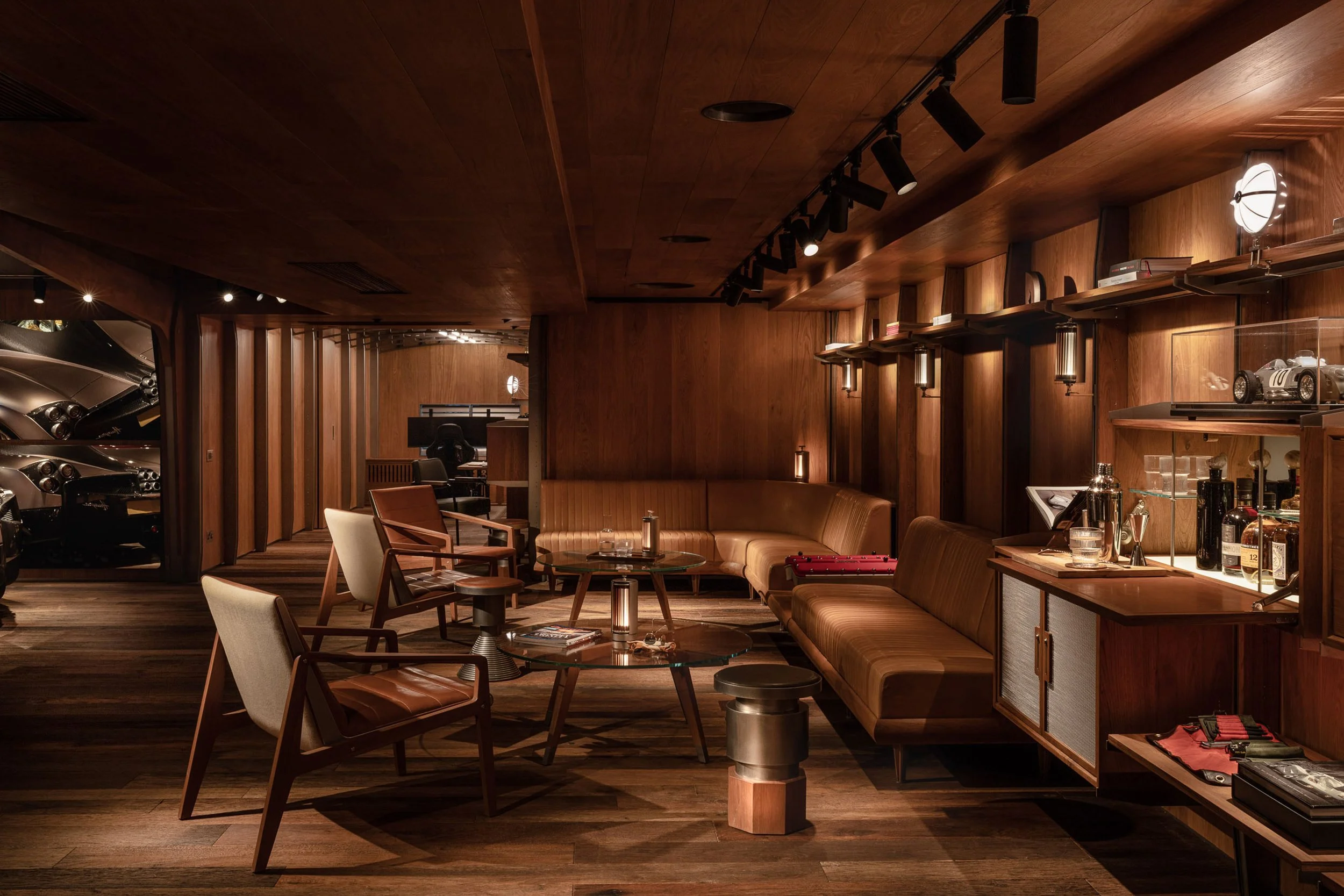A timber-clad enclosure, mirroring the design of the fluted walls and security booth, houses an elegant lounge adorned with crisp wood panelling, hand-stitched leather armchairs, and bespoke displays showcasing books and motoring mementos.