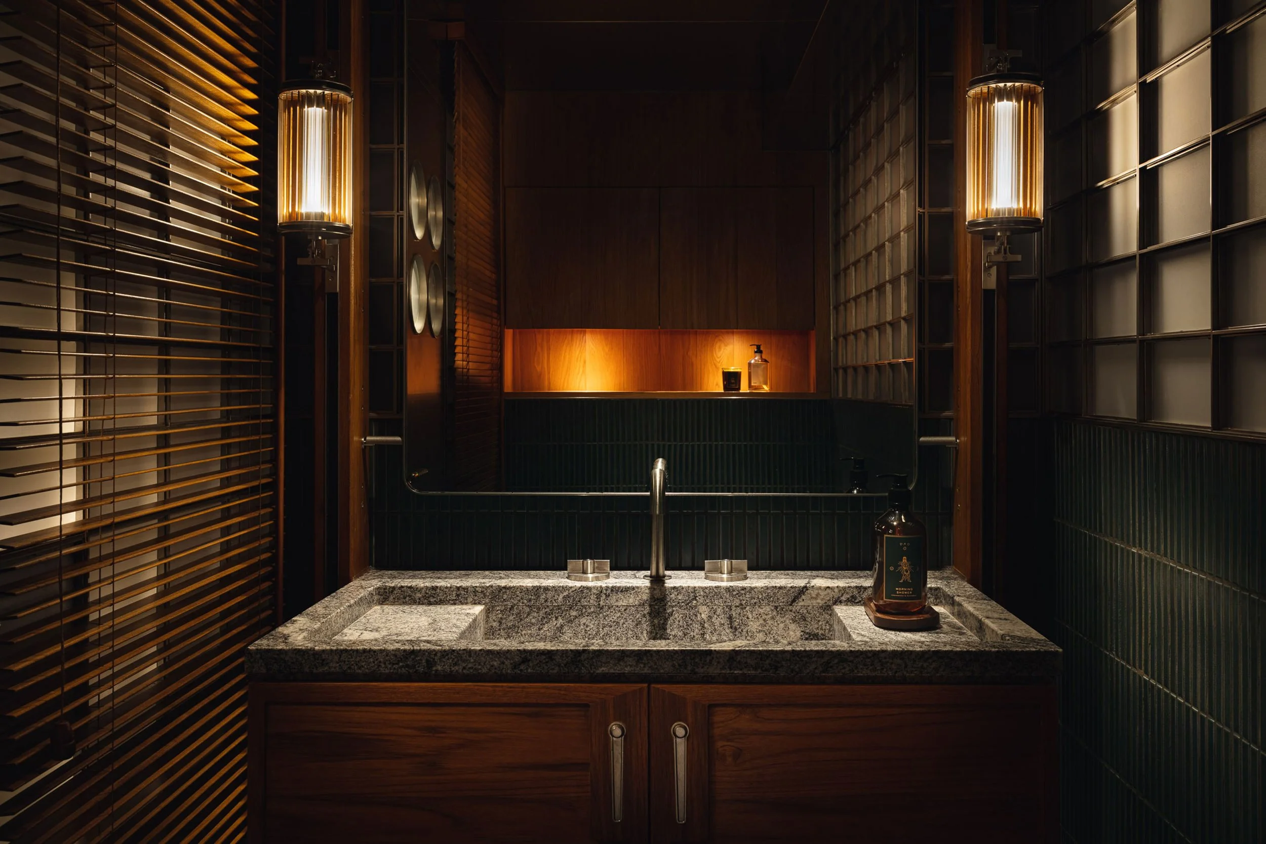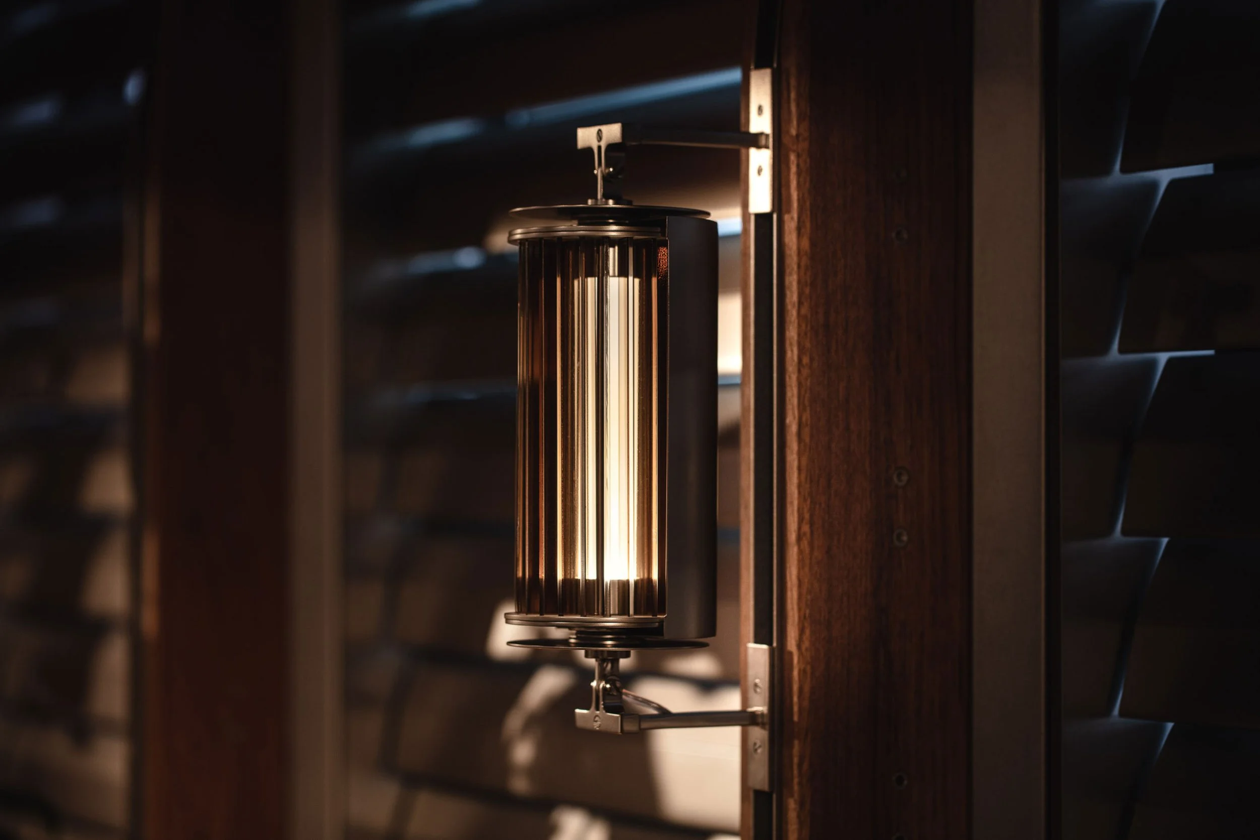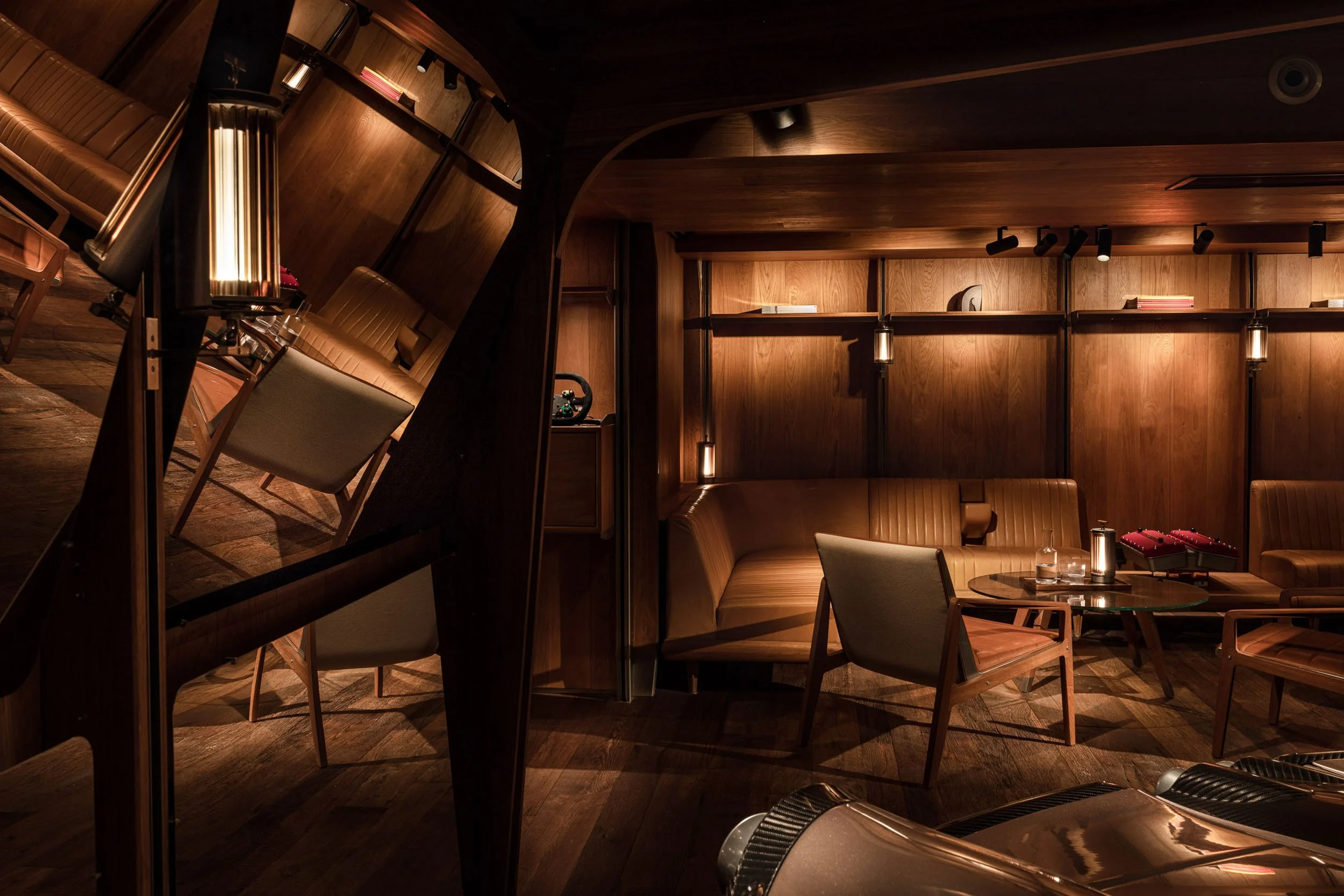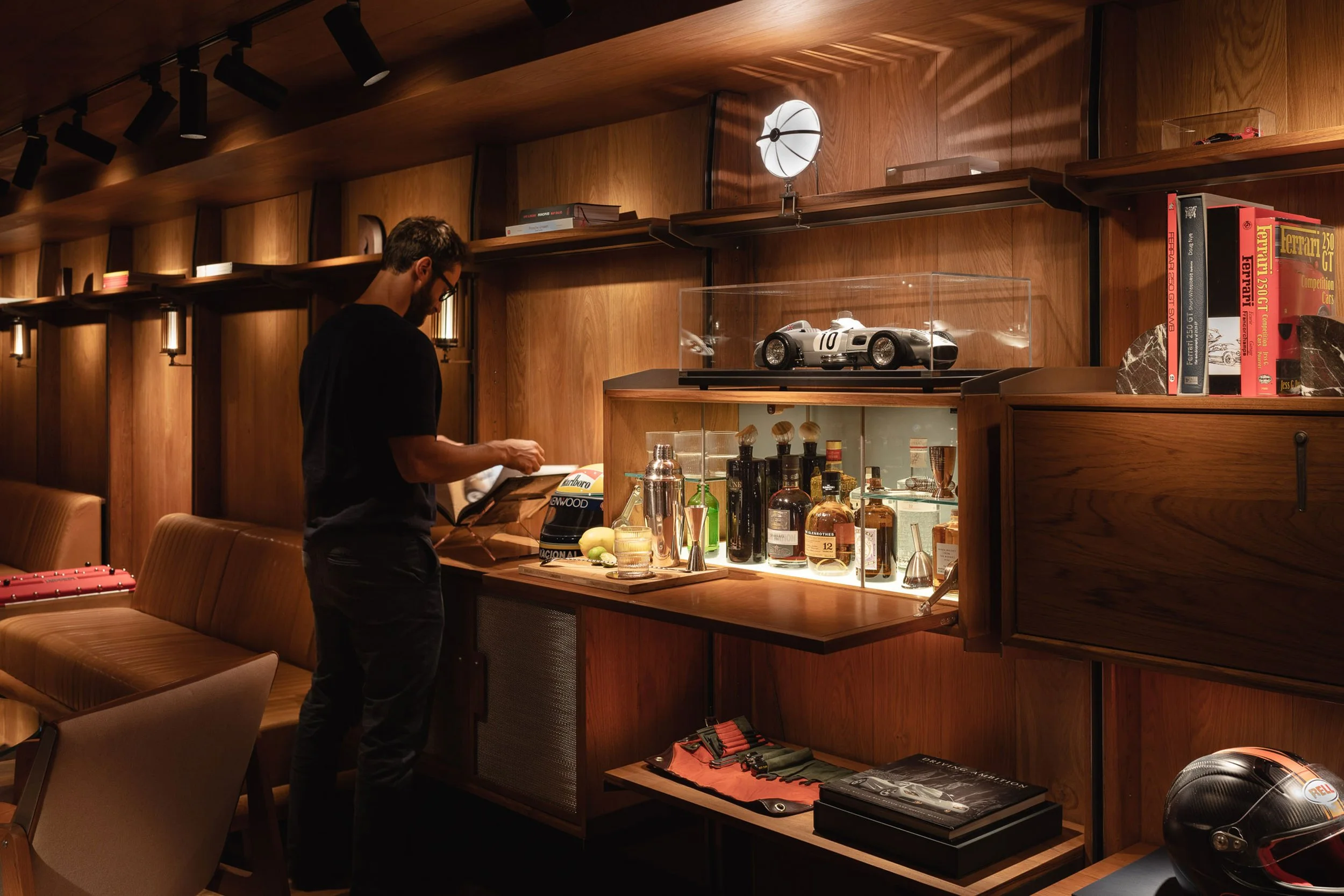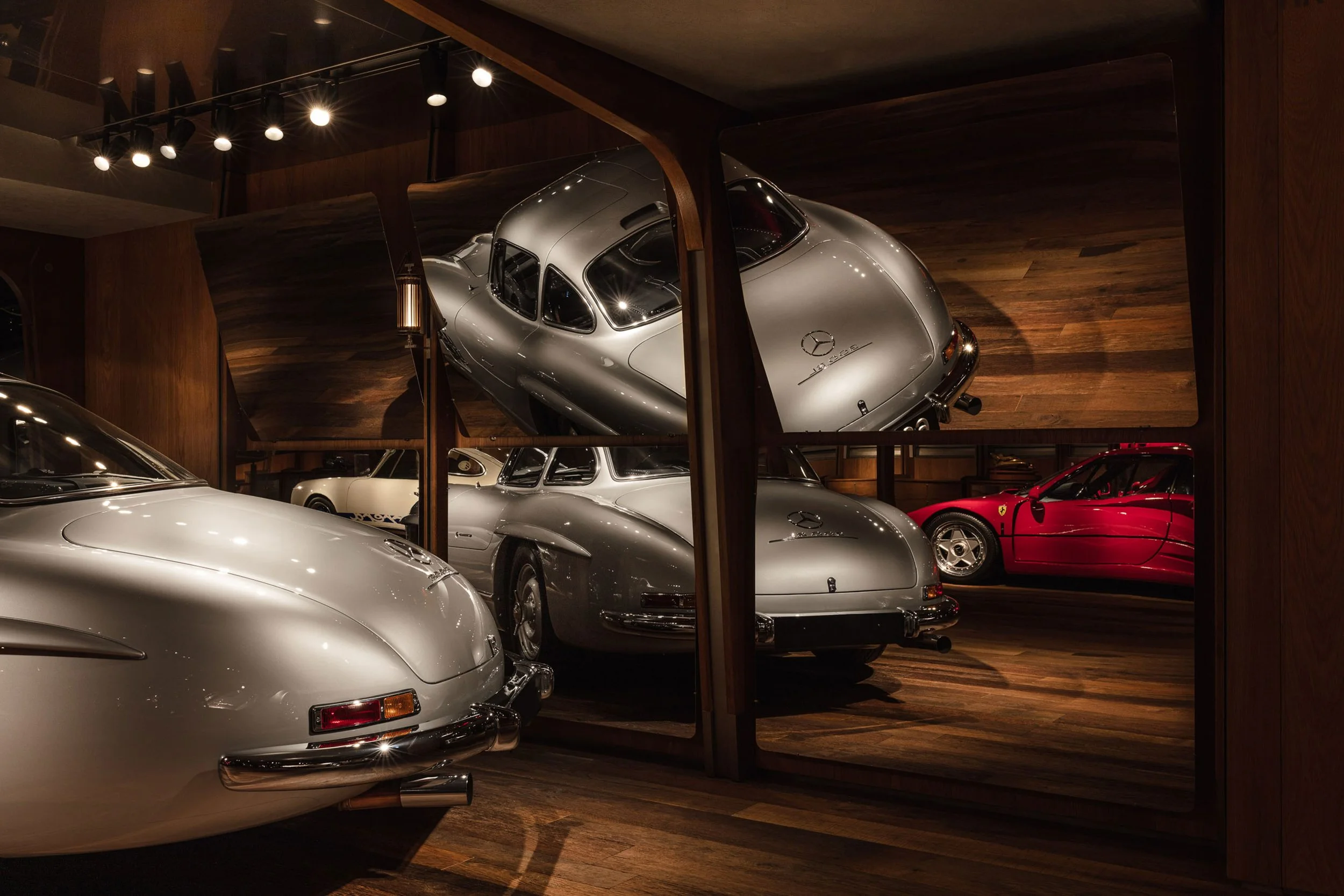 The interior design incorporates bespoke details inspired by automotive elements, paying homage to the cars' mechanical ingenuity while elevating the overall sophistication of the space. Lounge chairs celebrate the Ferrari Dino, cabinetry handles echo the door handles of a Zagato, and stools evoke the appearance of spark plugs. Motor references extend to the lighting fixtures, with spotlights resembling classic car head and tail lights, and lantern-like sconces featuring rotating gyroscopes for dimming. These meticulous details reflect the collector's deep passion for classic sports cars.