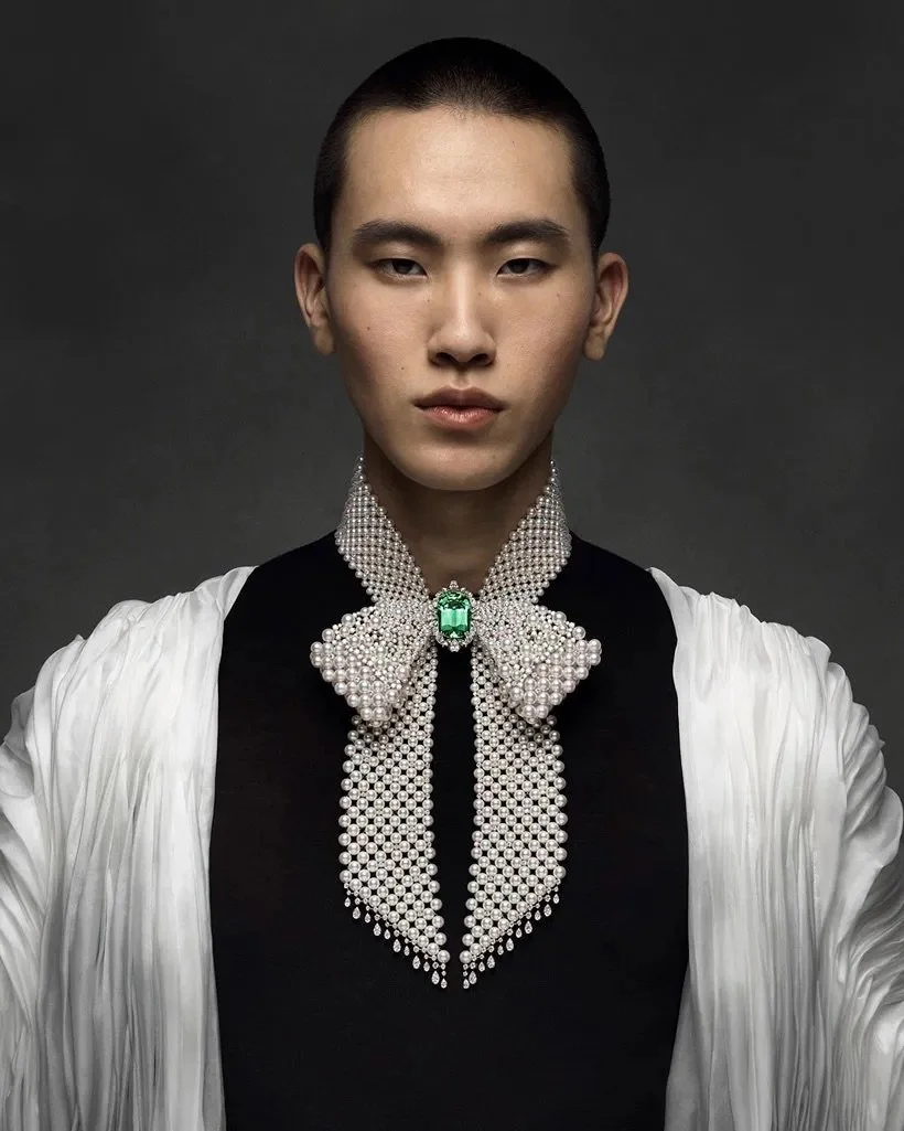 Some of The Bows' creations are inspired by the rococo style, where the lightness of ribbons blends with the crystalline tones of precious stones. One remarkable set harmoniously combines Akoya pearls, South Sea pearls, morganites, spinels, tourmalines, aquamarines and diamonds, evoking the grace of the Rococo era. Another centerpiece, structured with pearls and diamonds, recalls the world of haute couture. These ribbons structure the neck with sophistication, while the cultured pearls fall with natural elegance, catching every eye.
