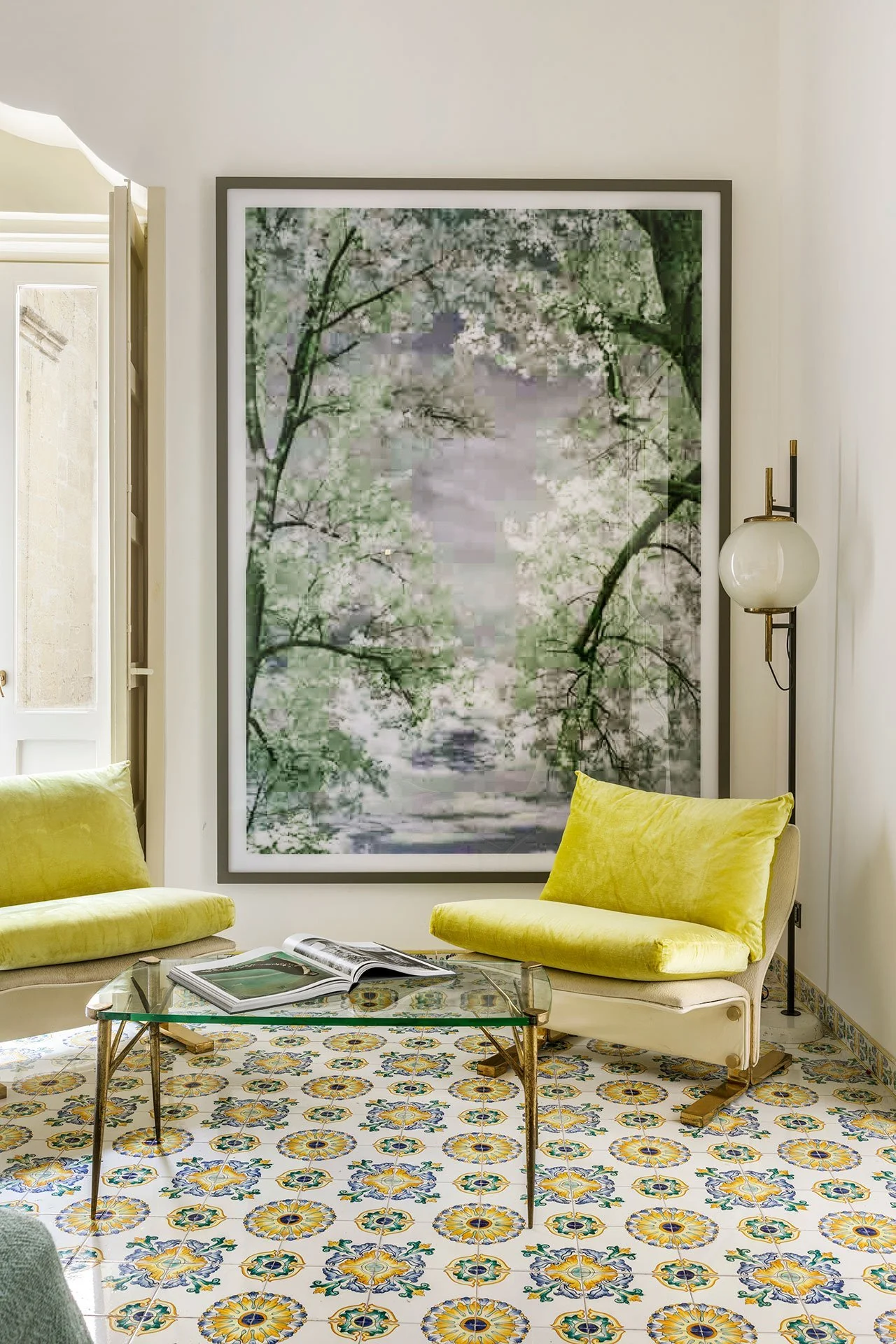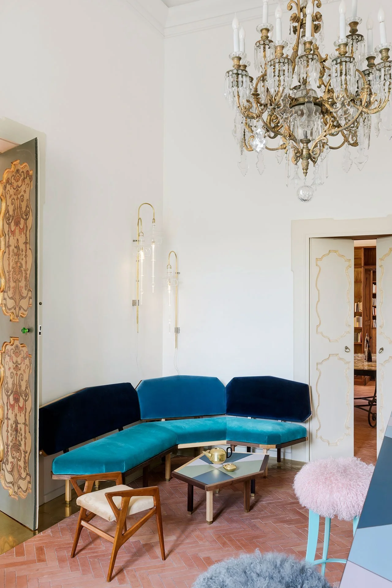 The main living room serves as a serene and luminous space, adorned with captivating artworks and furniture pieces. Palazzo Luce boasts two thoughtfully curated libraries, offering a haven for book lovers. The main library features a fusion of antique bookcases and vibrant polychrome tessellated sofas, while the De Secly library showcases a captivating round table adorned with majolica tiles.